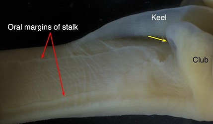 - Oral margins of stalk: Present, but very reduced and without trabeculae (Naef, 1921-23). (1) When protective membranes of club do not join proximally, oral margins of stalk abut/join protective membranes of club (see drawing of S. officinalis above). (2) When protective membranes joined proximally, oral margins of stalk may fuse with one another prior to abutting/joining protective membranes of club (see S. latimanus below).