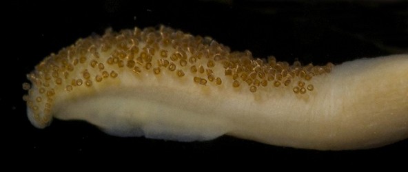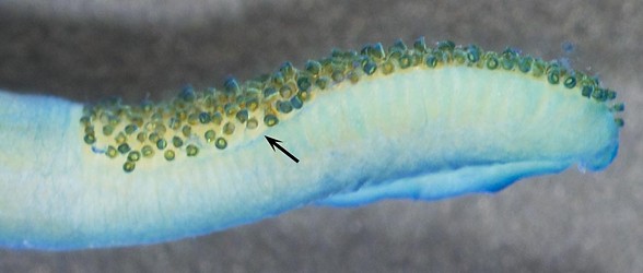 Figure. Spirula spirula , same tentacular club. Top - Ventral view, with light methylene blue stain showing the ventral margin (arrow); no dorsal margin was detected in the staining. Bottom left - Aboral view of distal half of club showing the long stalks of the ventral marginal suckers in more detail. Photomicrograph. Bottom right - Oral-distal view of the possible terminal pad. Arrow points to what could be a distal flap of a terminal pad. Photomicrograph.