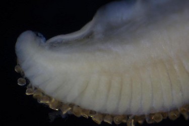 Figure. Spirula spirula, Female, 32 mm ML, tentacular club. Top - Oral view. Middle - Aboral view. Note the dorsal curvature of the club core. Bottom - Dorsal view showing more clearly where the keel attaches.