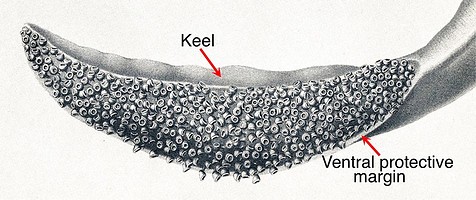 - Trabeculate, protective membranes: Absent; ventral margin marked by rounded edge; dorsal margin not found in our specimens. Position of edges at proximal end of club uncertain.