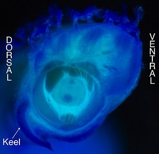 Figure. Spirula spirula, Left - Female, 37 mm ML. Cross-section through mid-club showing the basic structure of the club core, and the attachment of the keel and sucker stalks. Most of the core outside the axial nerve cord is composed of muscles. Dots on drawing areas indicate primarily longitudinal muscles. Other colors and fill-lines indicate more complex musculature. The red dot, on the aboral side of the nerve cord, is the major artery of the club; the blue dot, oral to the nerve cord, is the major vein of the club. More of the outer layer of the intercrossing fibers of the stalk reach through the pink layer than shown (this was done prevent obscuring the large pink layer). The drawing by R. Young is a compilation taken from histological cross-sections. Right - Mature male, 35 mm ML. Single cut, using scalpel, through middle of club and lightly stained with methylene blue to show attachment of keel. Also a hint of the outer and inner portions of the sucker stalks are apparent.